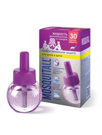 Жидкость для электрофумигатора MOSQUITALL "Профессиональная защита. Для дома и дачи" рассчитана на 30 ночей надежной защиты вашего дома от комаров. Вне зависимости от того,  будь то городская квартира или загородный дом, действующее вещество жидкости гарантированно уничтожает всех комаров внутри помещения площадью в 20 квадратных метров уже через 15 минут даже при открытых окнах! При этом жидкость Москитол не имеет запаха и полностью безопасна для людей и животных.