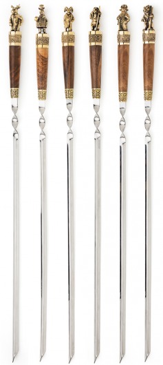 Особого внимания заслуживает ореховая рукоятка с литым бронзовым фигурным наконечником. Каждая фигурка — это автроская ювелирная работа. Ручка крупная, массивная, хорошо лежит в руке и при этом не перевешивает шампур.