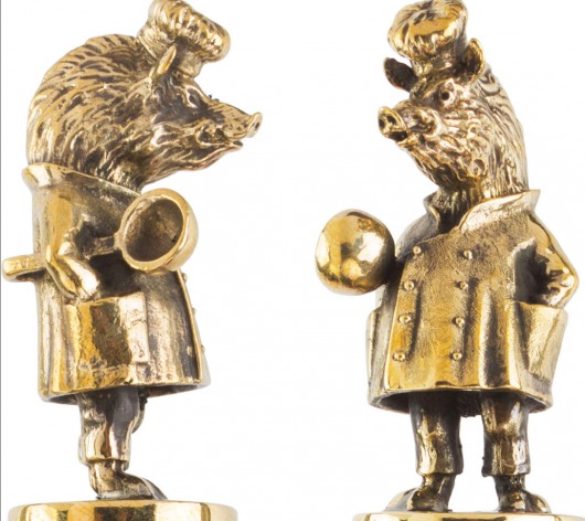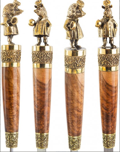 • Особого внимания заслуживает ореховая рукоятка с литым бронзовым фигурным наконечником. Каждая фигурка — это автроская ювелирная работа. Ручка крупная, массивная, хорошо лежит в руке и при этом не перевешивает шампур.