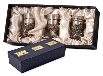 Мельхиоровые посеребреные стопки-перевертыши украшены золоченой надписью (вы можете заказать стопки с любой именной надписью).