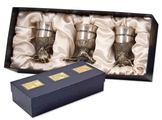 • Мельхиоровые посеребреные стопки-перевертыши украшены золоченой надписью (вы можете заказать стопки с любой именной надписью).