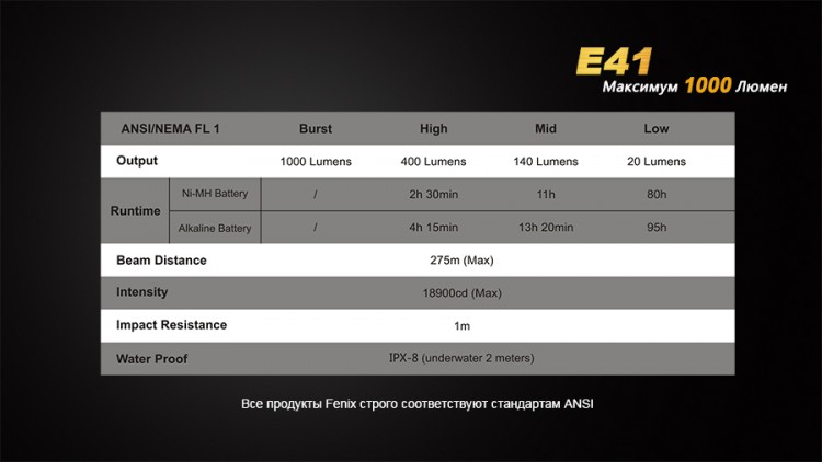 Карманный фонарик работает на широко доступных элементах питания АА, которых необходимо 4 шт. Это могут быть как перезаряжаемые аккумуляторы, так и обыкновенные батарейки. Корпус фонаря изготовлен из прочного алюминиевого сплава с анодированным антиабразивным покрытием. Кроме того, Fenix E41 можно использовать даже под дождем, поскольку он полностью водонепроницаемый (стандарт IPX-8).