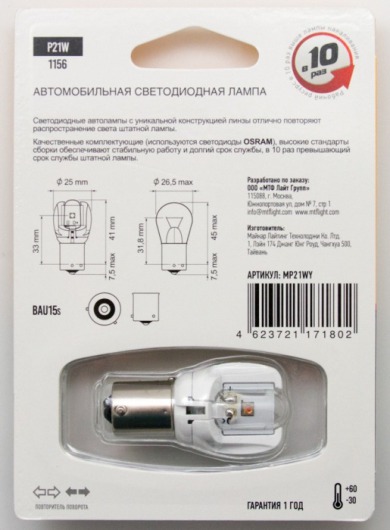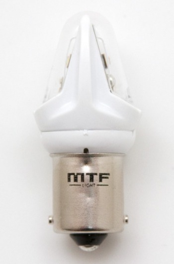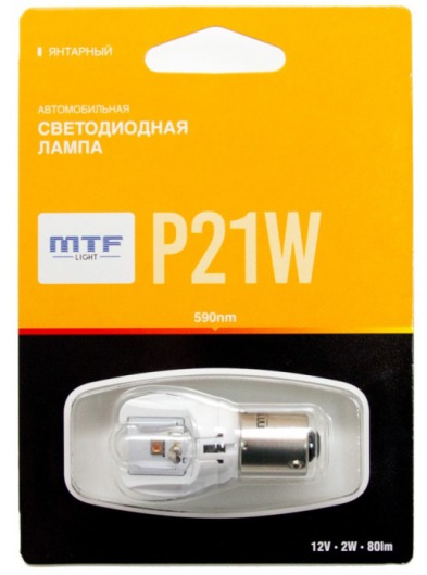 Светодиодная лампа MTF Light P21W с уникальной конструкцией линзы отлично повторяет распространение света штатной лампы. Цвет свечения автолампы: желтый.