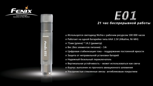 Главным преимуществом Fenix E01, которое выделяют производители, является его экономный расход энергии. От 1 заряда аккумулятора устройство способно проработать 21 ч без перерывов.