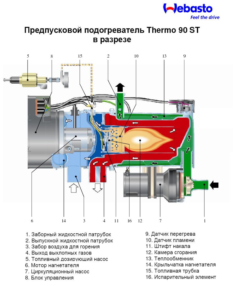Принцип работы подогревателя основан на разогреве жидкости  в сисеме охлаждения двигателя. Жидкость при этом принудительно прокачивается через теплообменную систему Вебасто. Webasto Thermo 90 ST  работает автономно, от двигателя автомобиля не зависит. Подключается он к аккумулятору и топливной системе автомобиля.