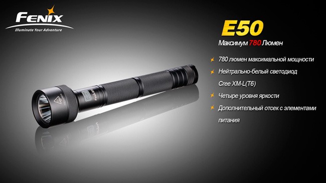 Поскольку фонарь Fenix E50 Cree XM-L (T6) относится к поисковым, производители укомплектовали его особенно ярким и надежным светодиодом. Речь идет о диоде американского происхождения Cree XM-L (T6). Этот полупроводниковый прибор обеспечивает освещение до 780 люмен с возможностью регулировки уровня яркости. Гарантированное время его работы составляет 50 000 часов.