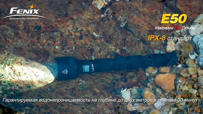 Корпус фонаря Fenix E50 Cree XM-L (T6) полностью алюминиевый. Он тщательно защищен от воздействия влаги и имеет высший уровень гидроизоляции по стандарту ANSI —IPX-8. Кроме того, анодирование Premium Tipe III защитит осветительное устройство от коррозии, царапин и прочих повреждений.