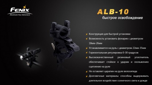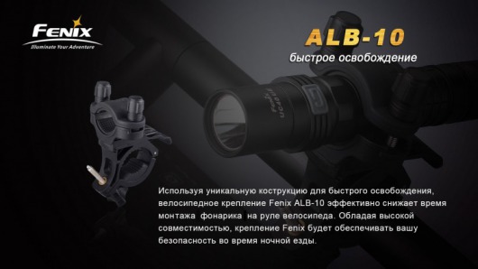 Велосипедное крепление Fenix ALB-10 позволяет регулировать направление света от закрепленного фонаря, поворачиваясь в диапазоне 30° по горизонтали. Кроме того, во время остановок фонарь можно быстро отсоединить от велосипеда и использовать в качестве ручного.