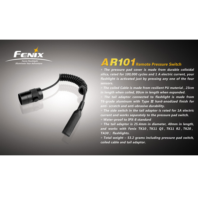 Корпус выносной кнопки Fenix AR101 изготовлена из сплава алюминия, который покрыт слоем защитного анодирования. Аксессуар полностью гидроизолирован, что открывает возможность использовать его в любую погоду. Рабочий потенциал кнопки — 100 000 нажатий. Выносная кнопка Fenix AR101 подходит для тактических фонарей TK: T1, TK10, TK11.