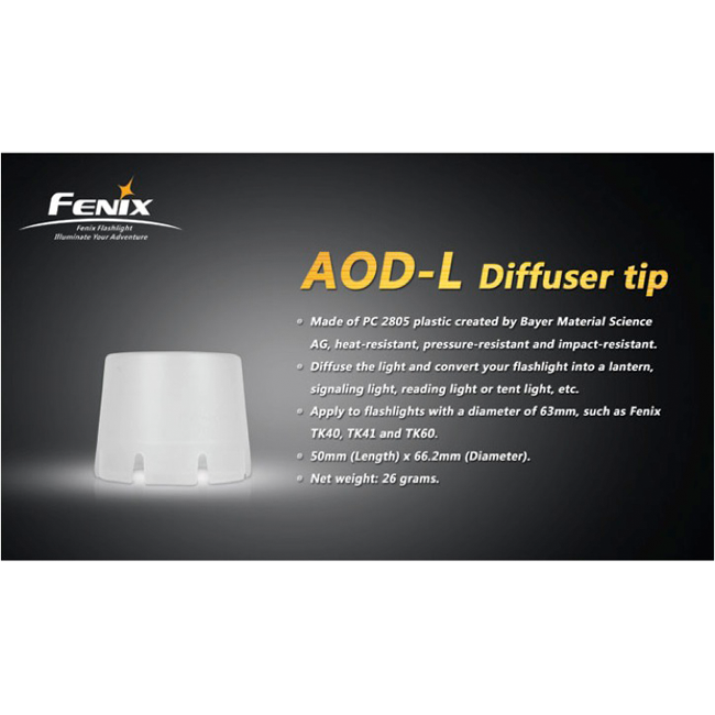 Диффузионный фильтр Fenix AOD-L внешне похож на небольшой пластиковый колпачок. Он сделан из пластика марки РС 2805, который хорошо переносит воздействие тепла от светодиода, перепады температур, механические нагрузки. Диаметр фильтра составляет 66,2 мм, а его высота равна 50 мм. Вес фильтра всего 26 г. При таких компактных габаритах диффузионный фильтр является очень полезным аксессуаром для каждого любителя отдыха на природе. Fenix AOD-L — это доступный по цене аксессуар, который, по сути, добавляет мощному и дальнобойному фонарю еще одну функцию — кемпинговое освещение. Этот вид света отличается мягкостью, тем, что распространяется он одновременно во всех направлениях и не слепит окружающих. Кемпинговое освещение будет нужно и туристам, и охотникам или рыбакам, и многим другим. При этом купить диффузионный фильтр Fenix AOD-L будет гораздо выгоднее, нежели приобретать специальный фонарь.