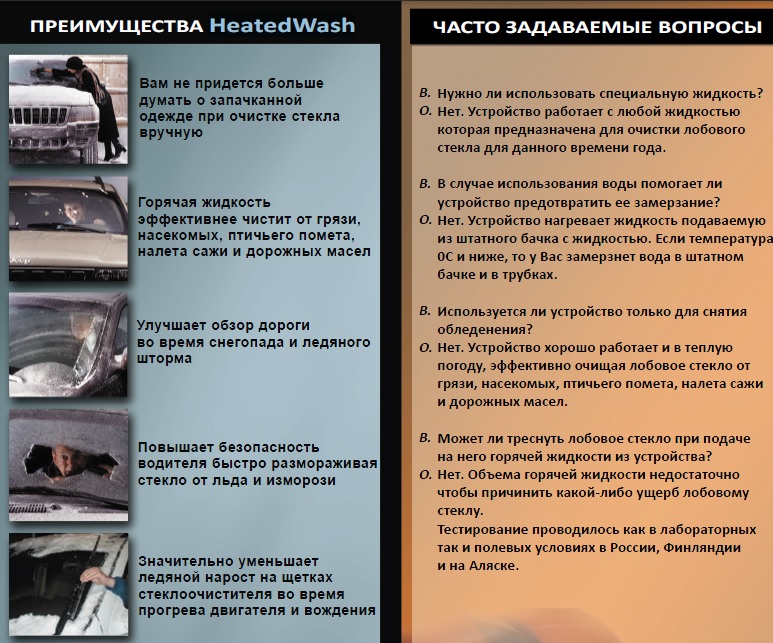 Устройство также увеличивает срок эксплуатации и качество работы щеток стеклоочистителя. Это связано с тем, что горячая жидкость быстрее растворяет грязь и лед, уменьшает количество абразивных частиц, которые контактируют со щетками.