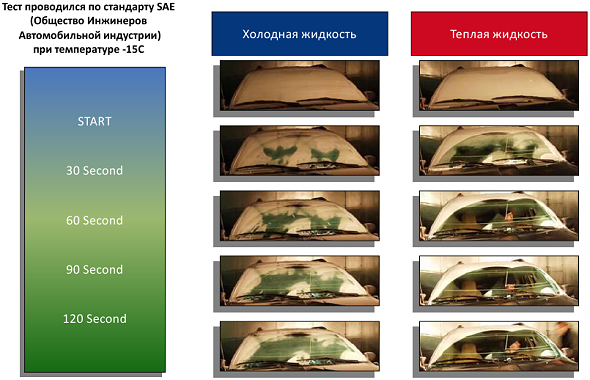 Устройство нагрева улучшает видимость во время движения. Об эффективности использования Alrha Therm можете судить по следубщему изображению. Слева – демонстрация того, как выглядит стекло после очистки горячей жидкостью. Справа – "работа" холодной жидкости.