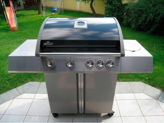 В комплектацию входит: основной корпус гриля с крышкой из нержавейки, чугунная основная решетка и стальная решетка вспомогательная, пять основных горелок и одна вспомогательная, складные боковые столы, фиксируемые колеса, встроенный термометр, лоток для жира.