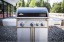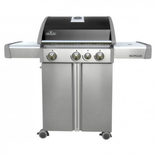 В комплектацию входит: основной корпус гриля с крышкой из нержавейки, чугунная основная решетка и стальная решетка вспомогательная, четыре основных горелок и одна вспомогательная, встроенный термометр, лоток для жира, складные боковые столы, фиксируемые колеса.