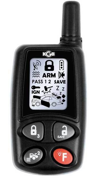 Сигнализация KGB VS-5900 комплектуется программируемым передатчиком с четырьмя кнопками, который имеет двухстороннюю связь и информативный ЖКИ-дисплей. Радиус действия в режиме оповещения составляет около 1000 метров, при условии минимального уровня застройки и относительно ровного рельефа местности. Связь брелока-передатчика с системой осуществляется при помощи динамического кода Keelog, который защищен от подмены и сканирования.
