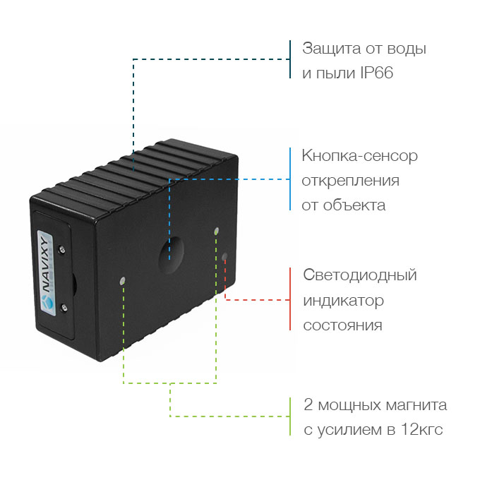 Герметичный корпус. У маяка высокая степень защиты корпуса IP66. Это значит, что трекер не боится ни пыли, ни грязи. Вы можете даже поливать его водой – с ним ничего не случится! Прочный корпус бережет электронику прибора от попадания влаги, поэтому Навикси М6 можно использовать даже в экстремальных погодных условиях. И, конечно же, благодаря такой защите, трекер подходит для охраны мотоциклов, его можно крепить снаружи на прицепах и контейнерах.