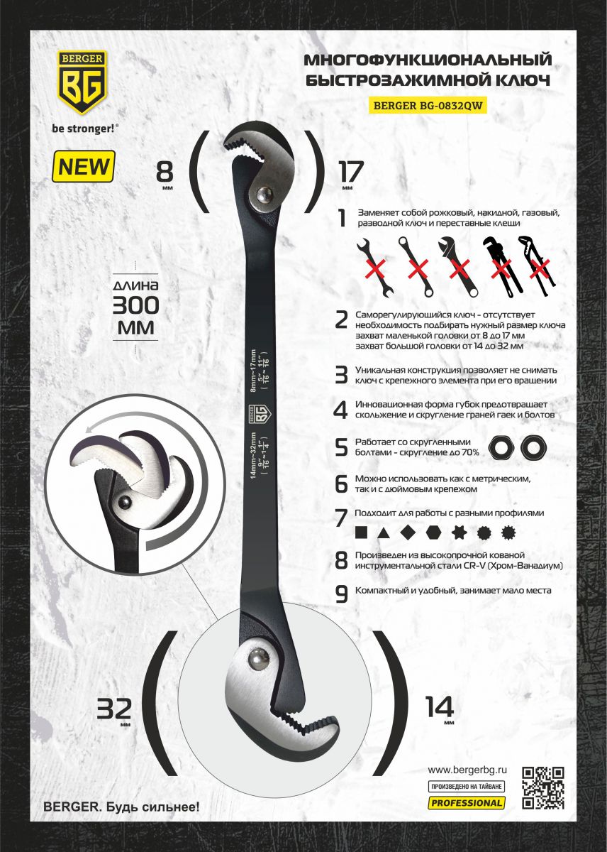 Вопросы и отзывы про Быстрозажимной гаечный ключ BERGER BG-0832QW (8-32 мм)