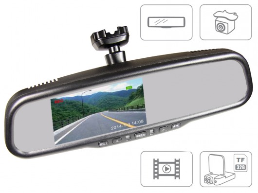 Автомобильное зеркало заднего вида с встроенным видеорегистратором является универсальным устройством, совмещающим в себе одновременно возможности сразу двух устройств, а камера видеорегистратора способна вести запись дорожной обстановки в высоком качестве. Также в зеркале есть встроенный дисплей 4.3", на него можно выводить картинку с камеры заднего вида. Управление функциями и настройками зеркала-видеорегистратора осуществляется с помощью кнопок расположенных на его корпусе.