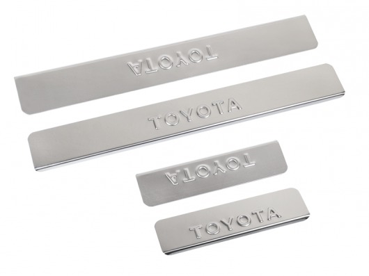 Внутренняя накладка на порог Toyota Corolla — это аксессуар автомобильного тюнинга, который защищает внутренний порог от механических повреждений при посадке и высадке из машины. Декоративные накладки с логотипом на внутренние пороги предназначены для автомобилей Тойота Королла до 2013 г.в.