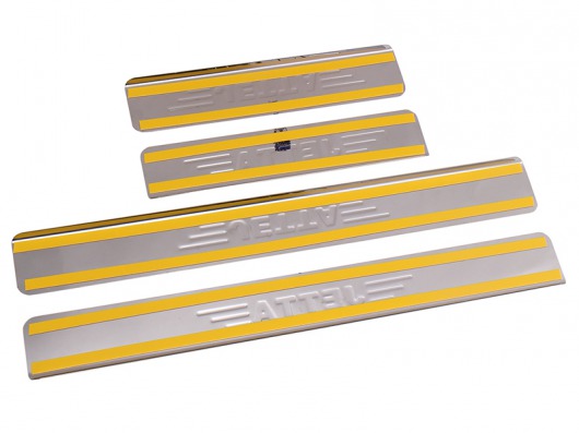 Накладки на металлические пороги дверей Volkswagen Jetta с логотипом авто не только обеспечивают защиту верхней и боковой поверхности внутреннего порога, но и отлично вписываются в интерьер автомобиля, подчеркивая его стиль и индивидуальность. C монтажом проблем не возникнет: установка накладок на внутренний порог для Фольксваген Джетта производится на штатные места с помощью скотча 3M.