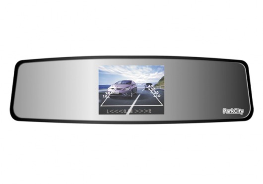 Информация от камеры и датчиков передается на дисплей. И здесь есть ещё одно отличие ParkCity Tokyo от остальных парктроников! Дисплей этой модели встроен в зеркало заднего вида, что само по себе очень удобно, т.к. не надо искать место для монитора. Более того, на дисплей выводится не только информация о препятствиях, но и картинка с камеры заднего вида. А имея перед глазами картинку, припарковаться ведь значительно проще!