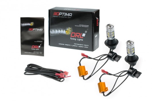 Дневные ходовые огни (DRL) Optima предназначены для установки в штатные посадочные места под лампочку поворотника. Может работать в 2-х режимах: для подсветки и индикации поворота, а также в режиме дневных ходовых огней (DRL).  При повороте светит желтым светом, при движении прямо — белым.