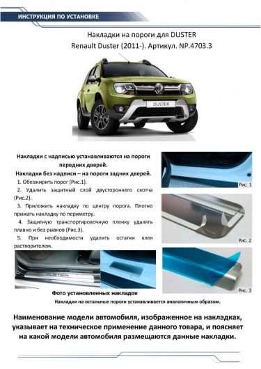 Вопросы и отзывы про Накладки на пороги для Renault Duster от 12 г.в. (Rival)