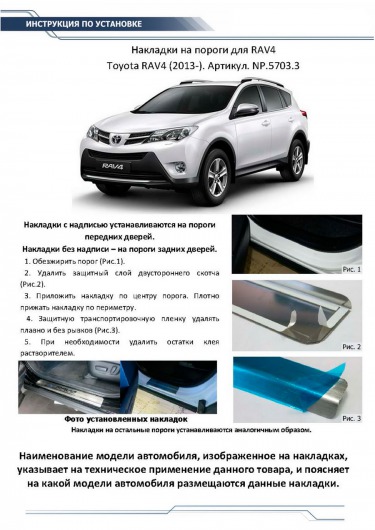 Данные накладки на внутренние пороги «Риваль» разработаны специально для автомобилей Toyota RAV4 от 2013 г.в. и полностью повторяют их геометрию. Кроме того, накладки порогов двери Rival очень легко и быстро устанавливаются. И при этом надежно крепятся за счет плотного прилегания морозостойкого скотча.