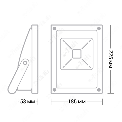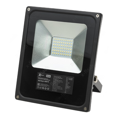 Размеры led прожектора — 225 × 185 × 53 мм. Данная модель рассчитана на напряжение 220 В. Мощность диодного прожектора X-Flash — 30 Вт., яркость — 2600 Лм, а температура свечения – 6500 K (это белый с синим оттенком свет).