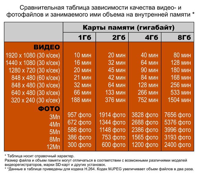 Сравнительная таблица зависимости качества видео- и фотофайлов и занимаего ими объема на внутренней памяти