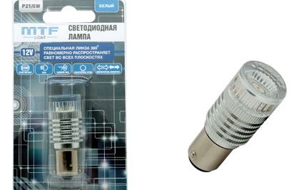 MTF P21/5W - светодиодная энергоэкономичная лампа. Цвет света - белый. Свет очень яркий, но при этом отлично воспринимается человеческим глазом. Линза 360° полностью освещает расположенную у основания лампы площадь отражателя и точно повторяет распространение света штатной лампы.