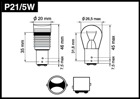 P21/5W двухконтактная, устанавливается в габариты и фонари заднего хода. Когда Вы подаете питание, промежуток времени с этого момента и до пика свечения у этой модели мгновенный. Это особенно важно в критических ситуациях, так как водитель сзади может быстрее среагировать на Ваш сигнал.