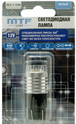 MTF W21/5W - светодиодная энергоэкономичная бесцокольная лампа. Цвет света - белый или красный. Свет очень яркий, но при этом отлично воспринимается человеческим глазом. Линза 360° полностью освещает расположенную у основания лампы площадь отражателя и точно повторяет распространение света штатной лампы.