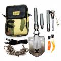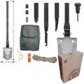 В комплекте мотыга, топор, багор, весло, отвертка, гвоздодер, линейка, компас, кусачки, открывалка, консервный нож, набор бит, жгут, моток паракорда, свисток, стеклобой, пила, ледоруб