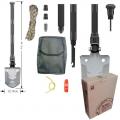 В комплекте мотыга, топор, багор, весло, отвертка, гвоздодер, линейка, компас, кусачки, открывалка, консервный нож, набор бит, жгут, моток паракорда, свисток, стеклобой, пила, led фонарик, съемные плафоны, огниво, USB-переходник, зарядка-переходник в прикуриватель